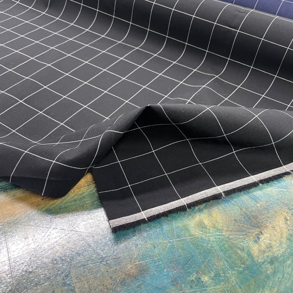 A simple but striking cotton/elastane printed fabric of black background with white squares. The elastane gives the fabric an approximate 20% stretch.
