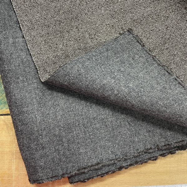 From our Tailors Cut selection. This grey cloth is a double sided, grey on the face and a brown stripe on the reverse. A heavier cloth, it would be perfect for a skirt, jacket, pants or blazer