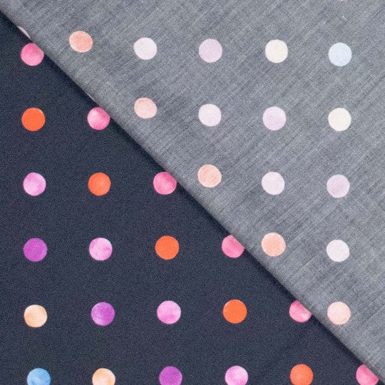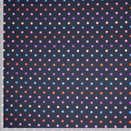 A slightly lighter weight poplin featuring coloured spots on a navy base. Perfect for blouses, tops and dresses.