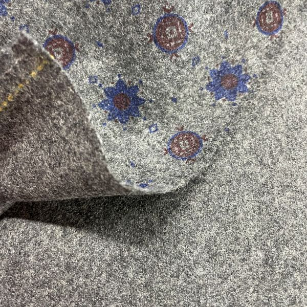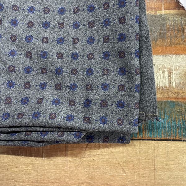 From our Tailors Cut selection. This grey cloth is has an interested printed feature of squares and starbursts. A heavier cloth, it would be perfect for a skirt, jacket, pants or blazer