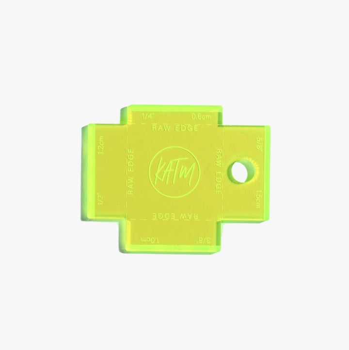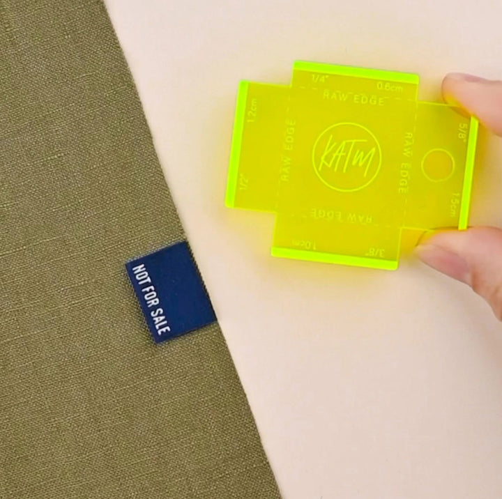 The KATM Label Gauge is a great tool to guide label placement with 4 different seam allowance measurements.